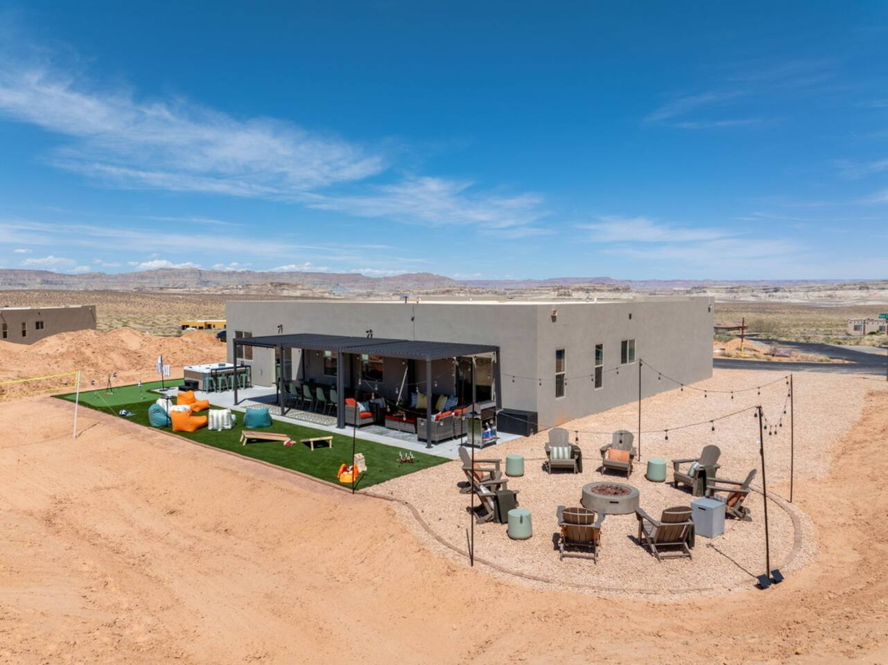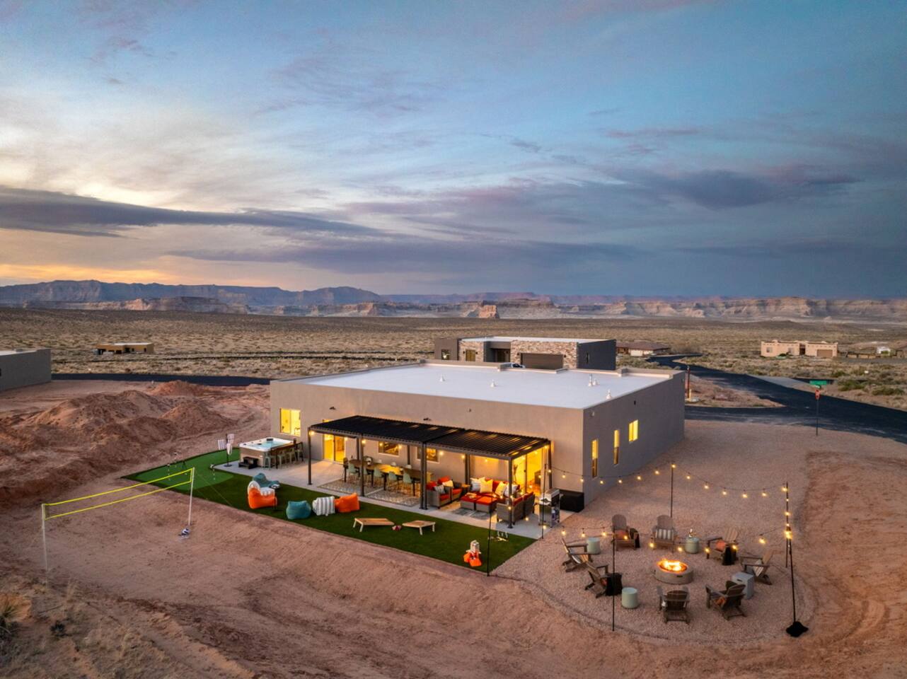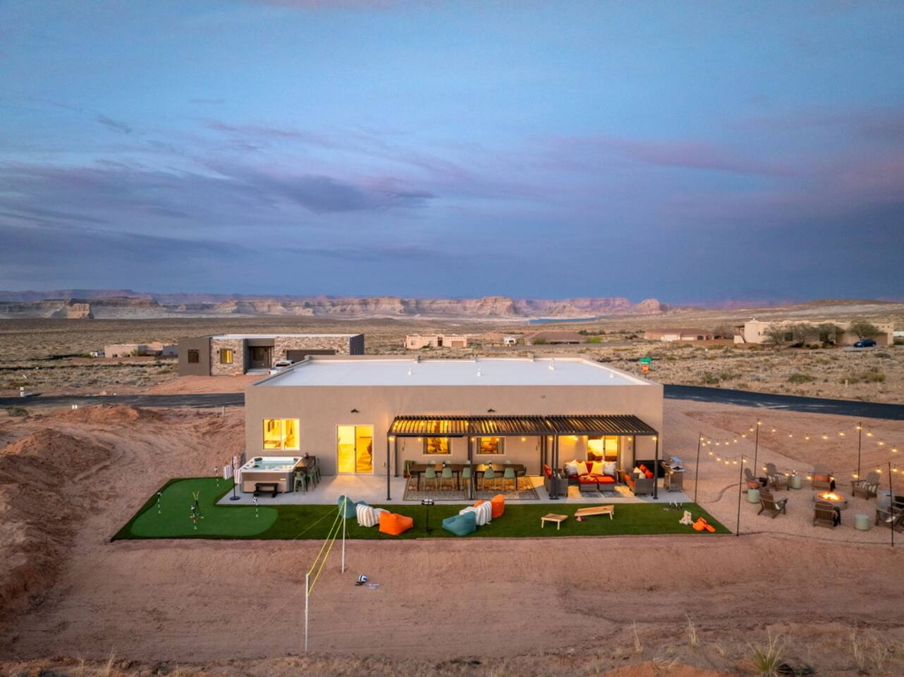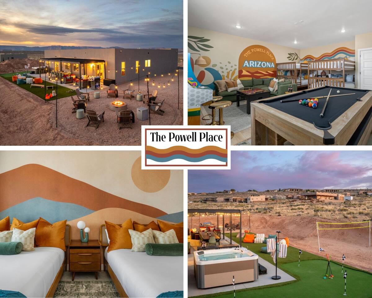 The Powell Place is just minutes from Wahweap Marina, Horseshoe Bend, and Glen Canyon Dam — the ideal spot for lake lovers, hikers, and relaxation seekers! Sleeps 18 | 5 Bedrooms | 3.5 Bathrooms Amenities: • Hot tub & fire pit • Putting green • Sand volleyball & badminton court • Game room with pool table, ping pong table, foosball table & arcade games • Outdoor movie theater & patio dining • Cornhole, giant Jenga, ring toss & yoga mats • Tons of parking – RVs, boats & jet skis welcome!