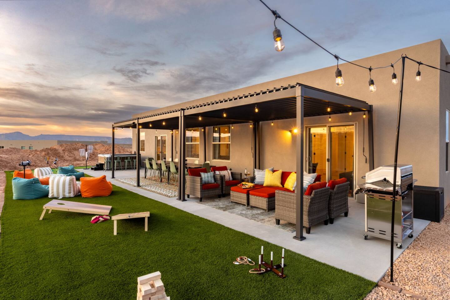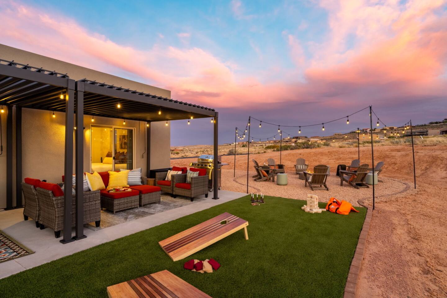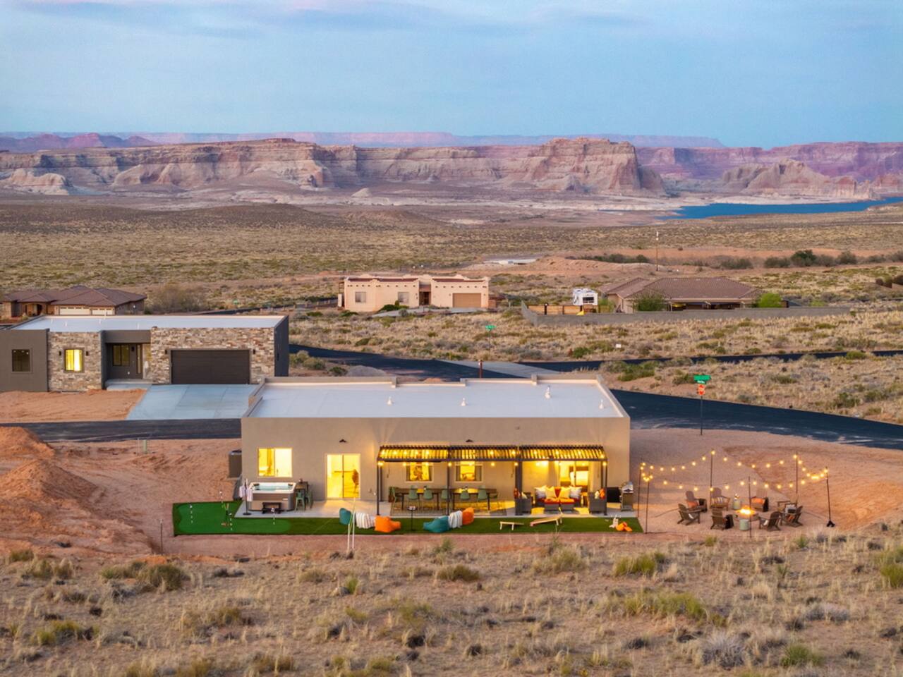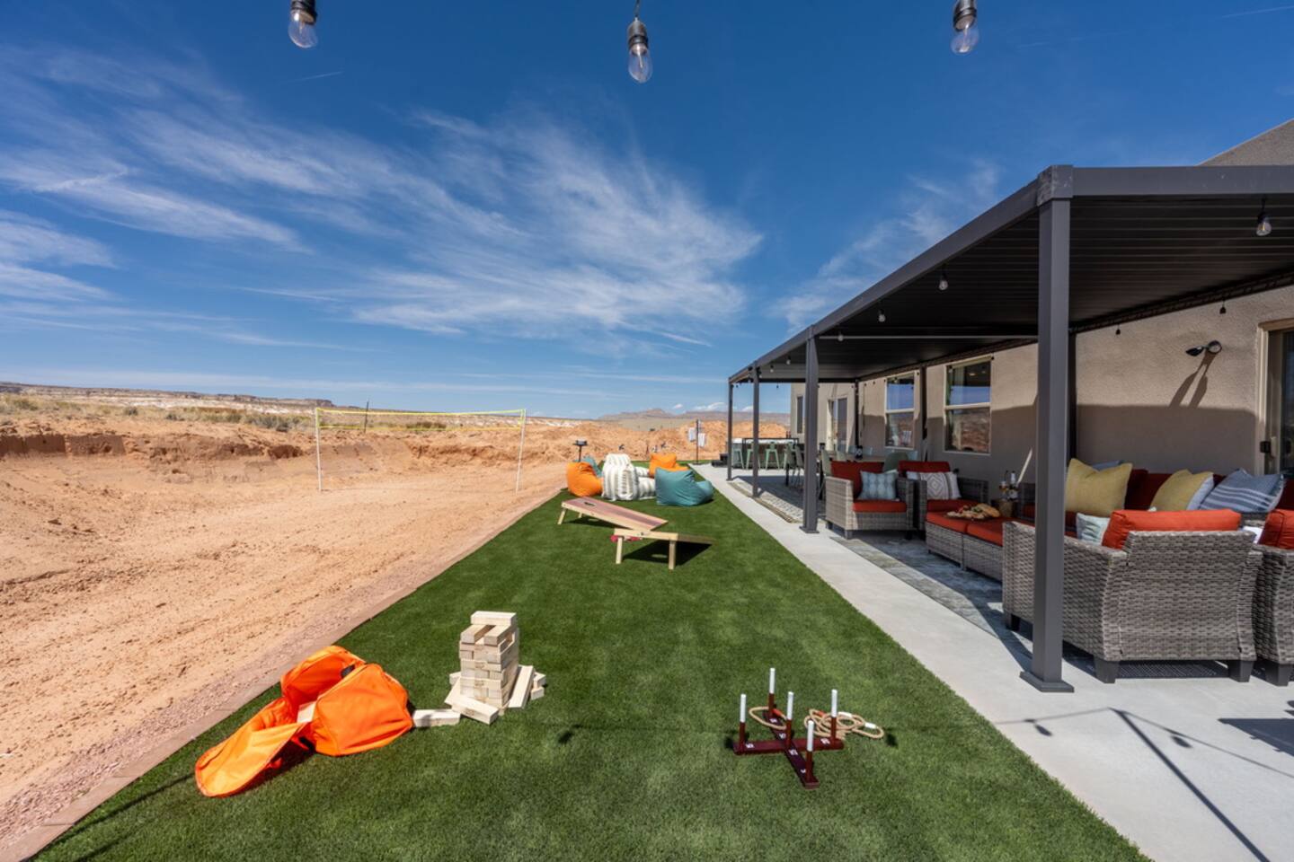 The Powell Place is just minutes from Wahweap Marina, Horseshoe Bend, and Glen Canyon Dam — the ideal spot for lake lovers, hikers, and relaxation seekers! Sleeps 18 | 5 Bedrooms | 3.5 Bathrooms Amenities: • Hot tub & fire pit • Putting green • Sand volleyball & badminton court • Game room with pool table, ping pong table, foosball table & arcade games • Outdoor movie theater & patio dining • Cornhole, giant Jenga, ring toss & yoga mats • Tons of parking – RVs, boats & jet skis welcome!